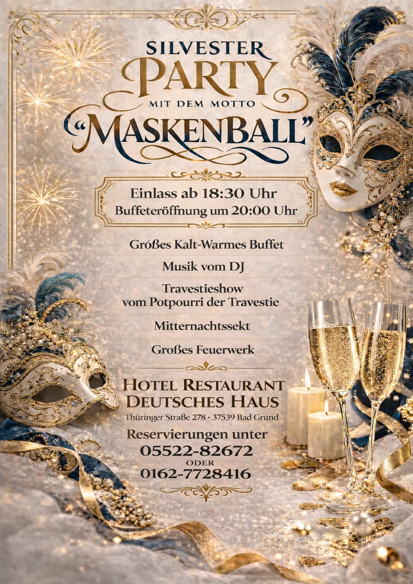 Eine Silvestergala der etwas anderen Art feiern Sie im Hotel - Restaurant Deutsches Haus. In jedem Jahr findet eine Silvestergala mit wechselnden Mottos statt. Feiern und genießen Sie eine Silvestergala mit ausgewählten Speisen auf unserem großen kalt-warmen Buffet!